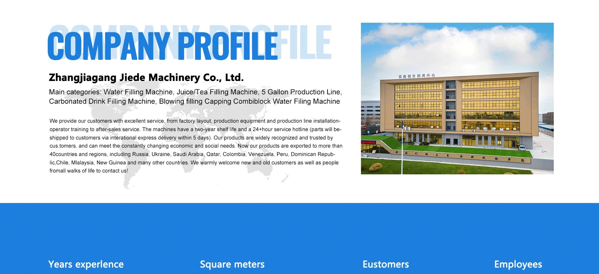 ผลิตภัณฑ์หลัก:เครื่องบรรจุน้ำเครื่องบรรจุน้ำผลไม้/ชาสายการผลิต5แกลลอนเครื่องบรรจุเครื่องดื่มอัดลมเครื่องเติมลม